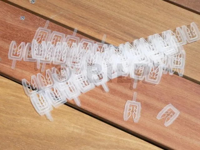 Die Keile bestehen aus Polypropylen, einem hochbeständigen Kunststoff, der unempfindlich gegen Frost und Feuchtigkeit ist und hohen Temperaturen standhält. Die Form des Keils und das Polypropylenmaterial machen es unmöglich, dass Feuchtigkeit aus dem Träger (z. B. einer Betonplatte) in das Holzteil gelangt. Es ist das ideale Material für diesen Einsatz.