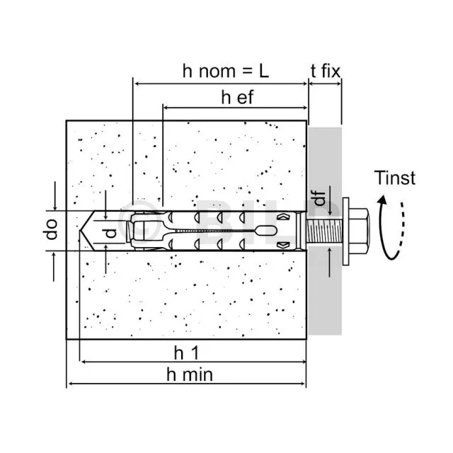 | Referenzen | Referenz | Bohr-Ø [d0] [mm] | Prof. min. Bohrtiefe [h1] [mm] | Ø Bohrung im zu befestigenden Teil (Durchgang) [df] [mm] | Anziehdrehmoment [Tinst] [Nm] | Prof. Verankerung [hef] [mm] | Ep. Mindestauflage [hmin] [mm] |