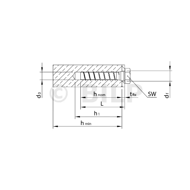 - Schraube zum Einsetzen ohne Dübel in ein vorgebohrtes Loch. Der Durchmesser der Bohrkrone zum Vorbohren wird im Merkmal "Nenndurchmesser der Bohrkrone, d0" angegeben.