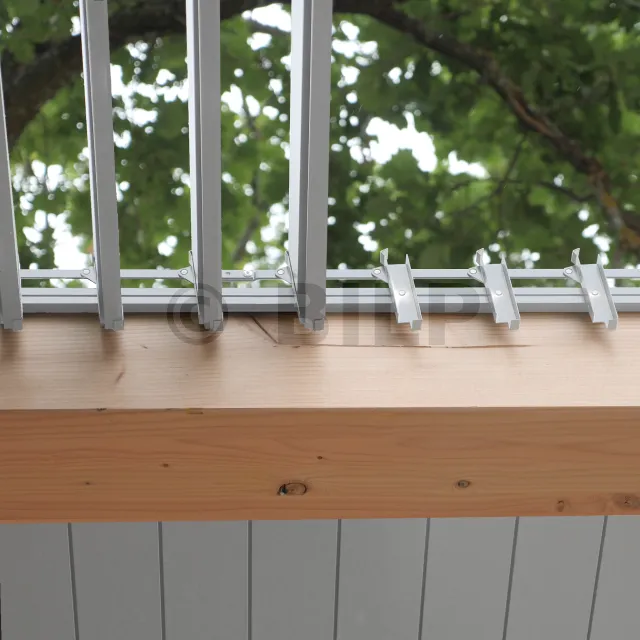 Unsichtbare Befestigung: Die Mechanismen werden durch ein spezielles Endstück zusammengefügt, das selbst am Träger (z. B. Pergolabalken) befestigt ist. Die Befestigung muss einen Durchmesser von 5 mm haben und aus Edelstahl bestehen. Seine Länge und Art hängen vom Träger ab: