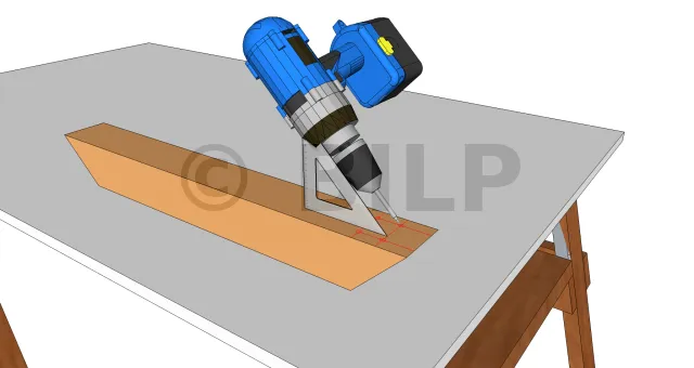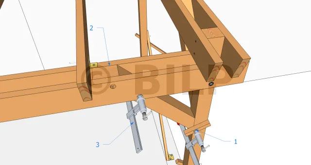 1) Führen Sie die Strebe entsprechend dem obigen Diagramm schnell ein. Bringen Sie eine Schraubzwinge unter der Strebe an. Mit dieser Schraubzwinge können Sie die Strebe unter dem Pfosten ausrichten und gleichzeitig den Pfosten in Position halten. Kleine Latten auf beiden Seiten erleichtern die Ausrichtung.