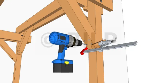2) Richten Sie das obere Ende der Strebe mit der Oberseite der Tragbalken aus.