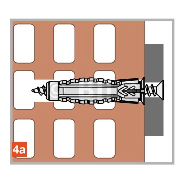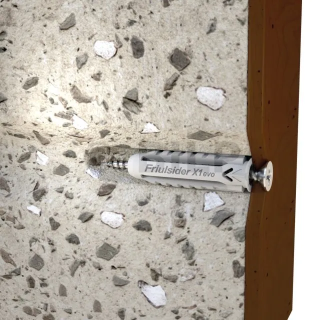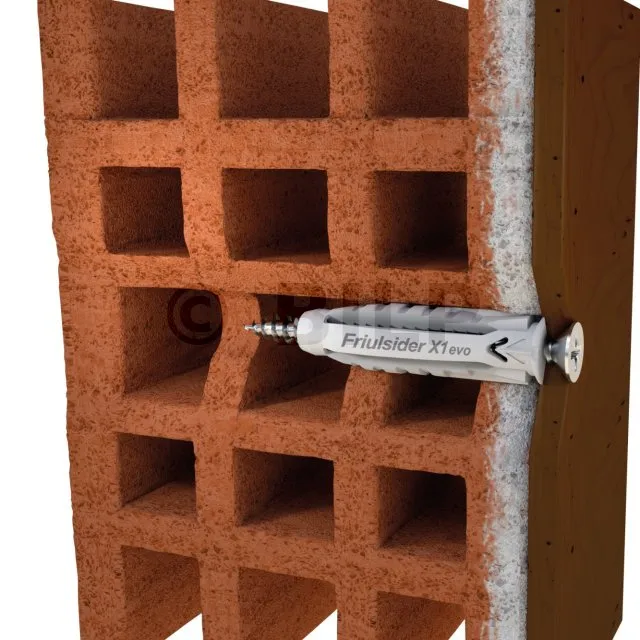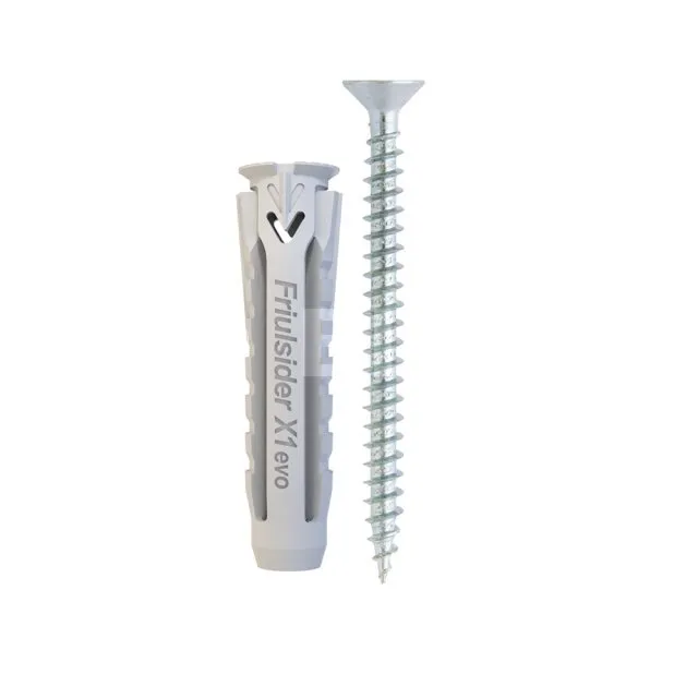 Der universelle Nylonanker X1 evo ermöglicht die optimale Befestigung von Elementen auf allen Arten von massiven oder hohlen Trägern, insbesondere auf Gipskartonplatten. Mit allen Arten von Schrauben: Holzgewindeschrauben, metrische Gewindeschrauben. Mit breiter und stabiler Auflage durch die 4 Segmente, die bei der Montage hinter der Stütze eine Rosette bilden.