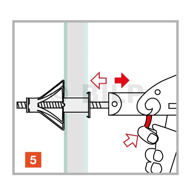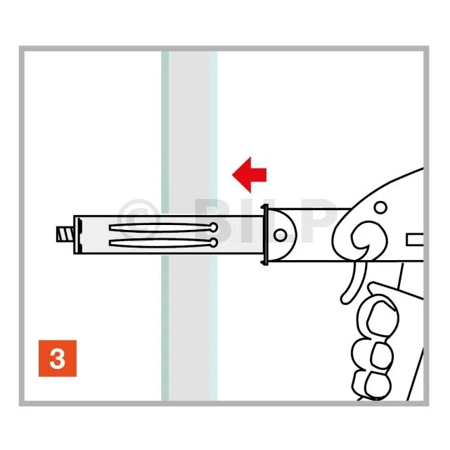 Der Dübel wird mit einer speziellen Klemme in das Loch am Träger eingesetzt. Durch die Wirkung der Zange kann der Dübel aufgespreizt und am Träger fixiert werden.