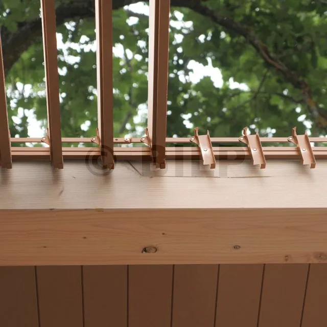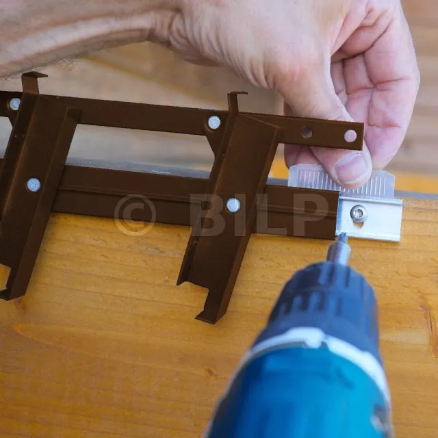 Unsichtbare Befestigung: Die Mechanismen werden durch ein spezielles Endstück zusammengefügt, das selbst am Träger (z. B. Pergolabalken) befestigt ist. Die Befestigung muss einen Durchmesser von 5 mm haben und aus Edelstahl bestehen. Seine Länge und Art hängen vom Träger ab:
