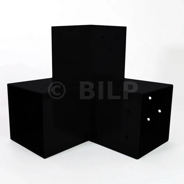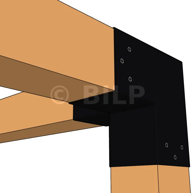 Es wird in einer Außenecke verwendet. Mit diesem Verbinder können Sie einen 90 x 90 mm großen Balken senkrecht mit einem 90 x 90 mm großen Balken verbinden, wobei das Ganze von einem 90 x 90 mm großen vertikalen Pfosten getragen wird.