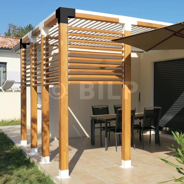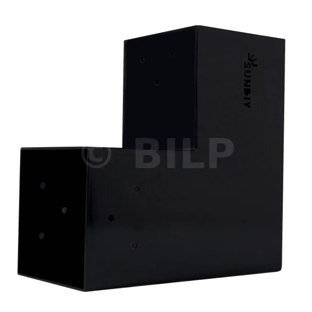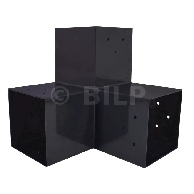 Es wird in einer Außenecke verwendet. Mit diesem Verbinder können Sie einen großen 120 x 120 mm großen Balken senkrecht mit einem 120 x 120 mm großen Balken verbinden, wobei das Ganze von einem 120 x 120 mm großen vertikalen Pfosten getragen wird.