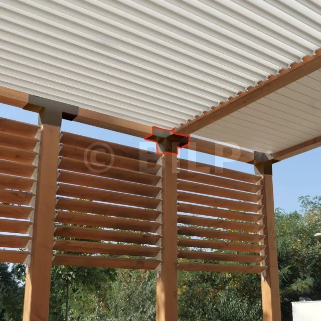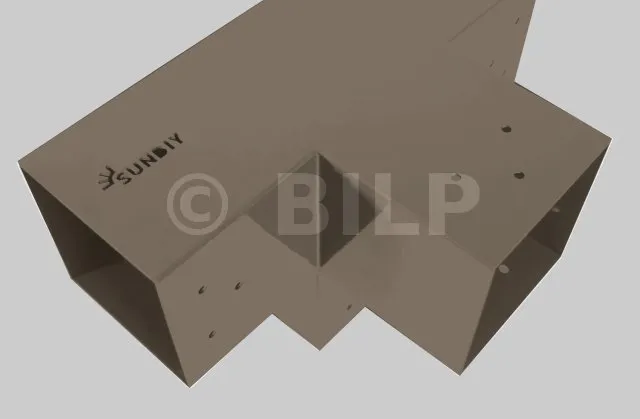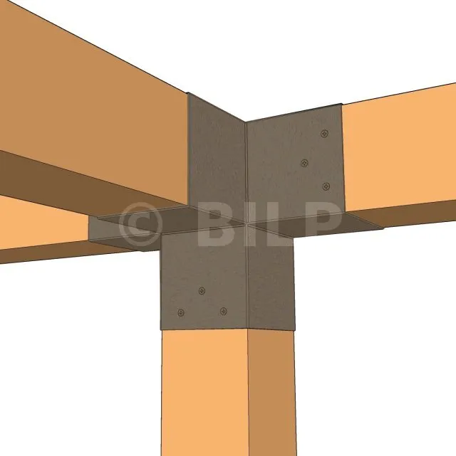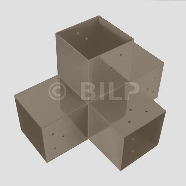 Damit kann eine 120x120mm-Stütze senkrecht zu einem 120x120mm-Chevron angebracht werden, die insgesamt von einem 120x120mm-Vertikaltopf unterstützt wird.