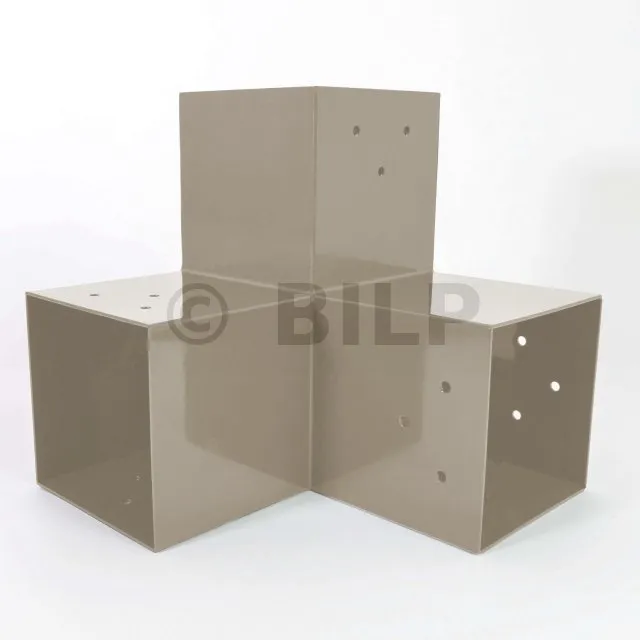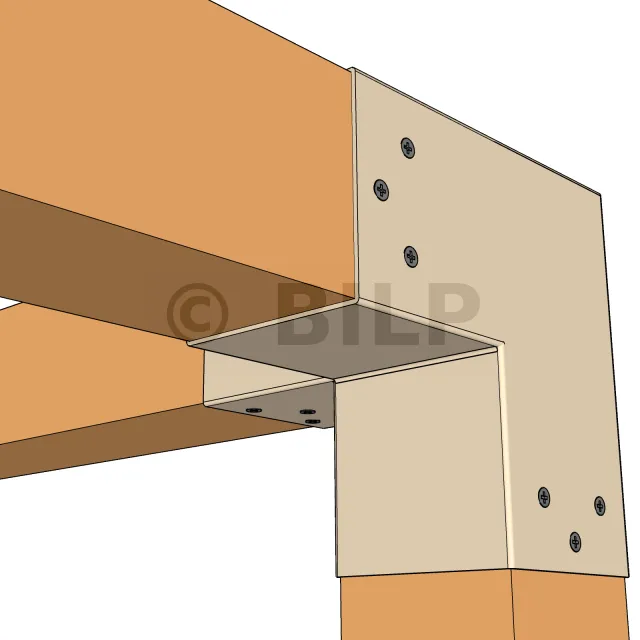 Es wird in einer Außenecke verwendet. Mit diesem Verbinder können Sie einen 90 x 90 mm großen Balken senkrecht mit einem 90 x 90 mm großen Balken verbinden, wobei das Ganze von einem 90 x 90 mm großen vertikalen Pfosten getragen wird.