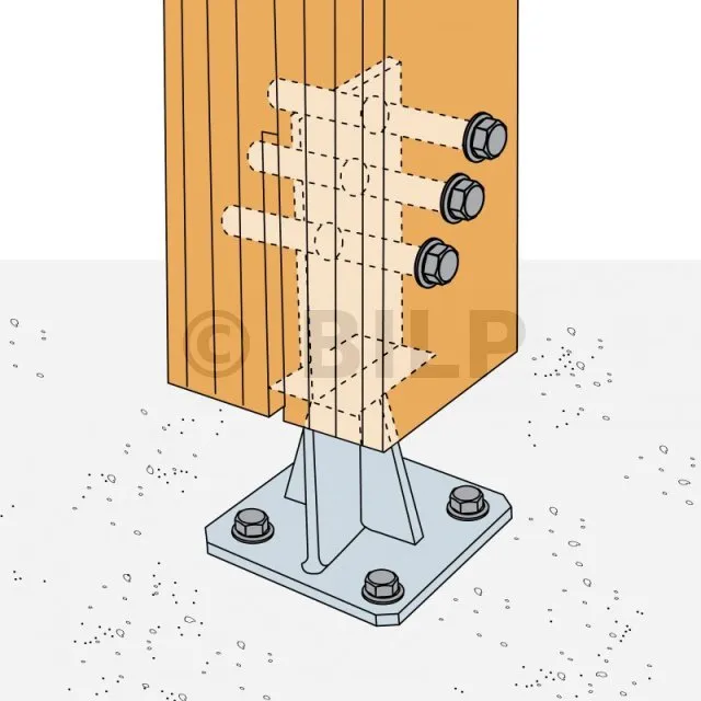 - Holzverbindung auf starrem TrägerAm Pfosten : 1 STD12 ; auf Beton : 4Ø12 (WA-Dübel M12 ; Gewindestange M12), auf Stahl : Bolzen