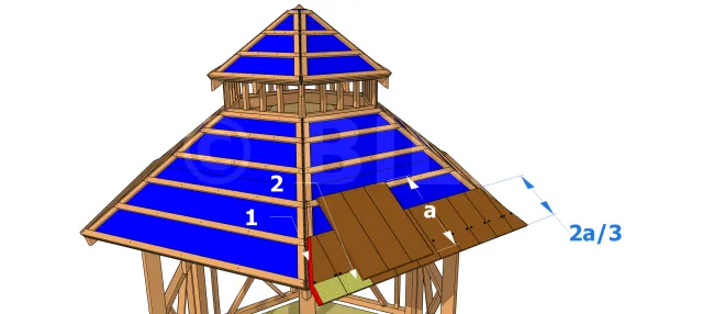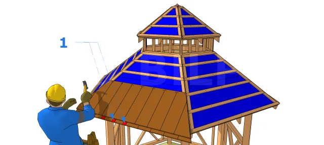 La première rangée de bardeaux (ou doublis de départ) est clouée sur le liteau doublé (ou posé verticalement) le long de la partie inférieure de la toiture. Respectez un dépassement de toiture de 2 cm sur les côtés et 2a/3 cm sur le devant.