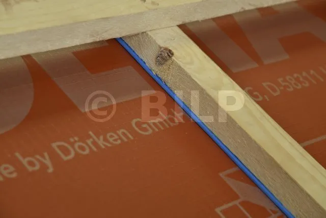 Aufnagelbares Dichtband mit einer selbstklebenden, geschlossenzelligen Polyethylenschaum-Oberfläche in Kombination mit einer integrierten Silikonfolie. Verbessert die Abdichtung zwischen DELTA® -Bahnen an den Perforationen, die durch die Befestigung der Konterlatten und Latten entstehen (kein Sickerphänomen).