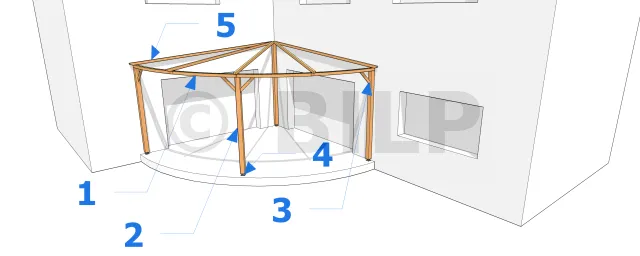 Ein großartiges Ergebnis, zwischen zwei senkrechten Fassaden, ob vor dem Eingang des Hauses oder in einer Ecke Ihres Gebäudes. Die Komplikation liegt im abgerundeten Balken, aber die horizontalen Sparren stellen kein Problem dar, da sie an den Eckpfosten und dem abgerundeten Balken befestigt werden.