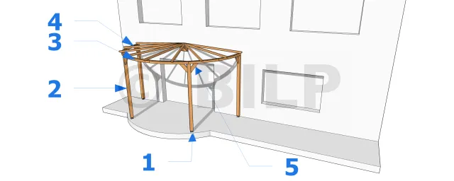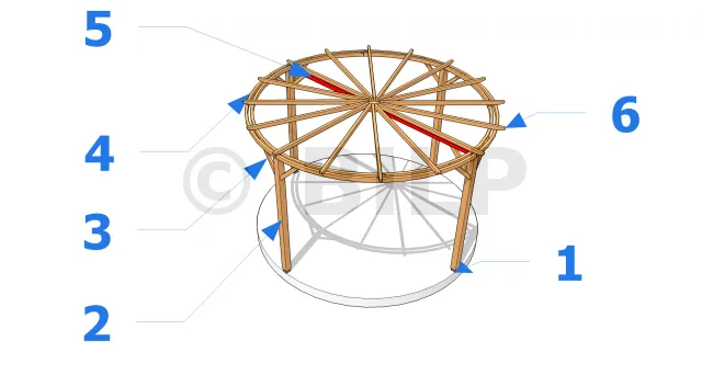 - 1 : Pfostenfüße ; 2 : Pfosten ; 3 : Aussteifungsarm ; 4 : Abgerundeter Balken ; 5 : Balkendurchmesser ; 6 : Sparren