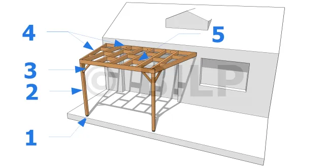 - 1 : Pfostenträger, 2 : Pfosten, 3 : Aussteifung, 4 : Tragbalken, 5 : Abstandhalter