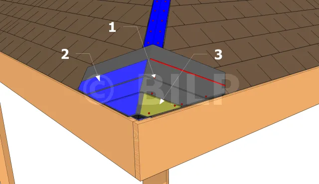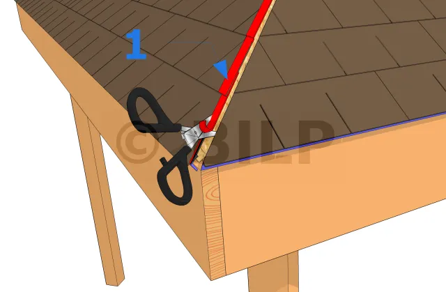 Travailler le long de la crête contre le sens des vents dominants, de sorte que les chevauchements puissent affronter le vent et la pluie battante. Dans le cas où vous utilisez une faîtière de type 30 cm ; poser les faîtières le long de la crête suivant la ligne de référence tracée de part et d’autre du sommet. La première faîtière doit embrasser la bordure de la bande de rive. Bien clouer la première faîtière. Superposez la prochaine faîtière à 13 cm de la première et clouez-les ensemble par la suite. Suivre les mêmes instructions pour poser les autres faîtières tout en les alignant le long de la ligne de référence.