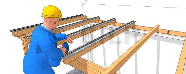 - oder ein Seil, das horizontal durch zwei vorfixierte Nägel an den Enden der Pfetten gespannt wird. Dieses Seil wird bei jedem Fortschritt der Anlage bewegt.