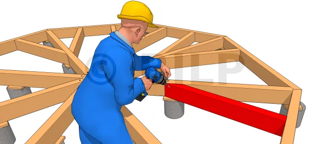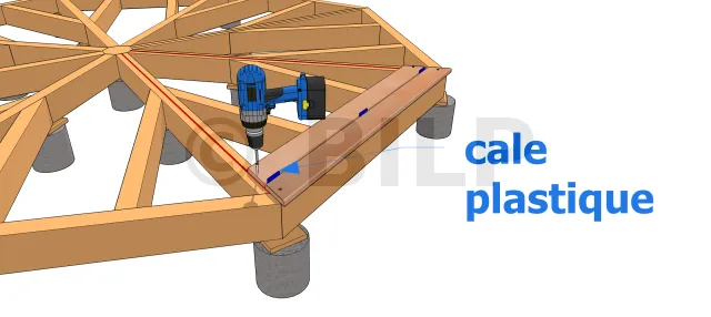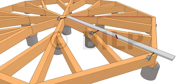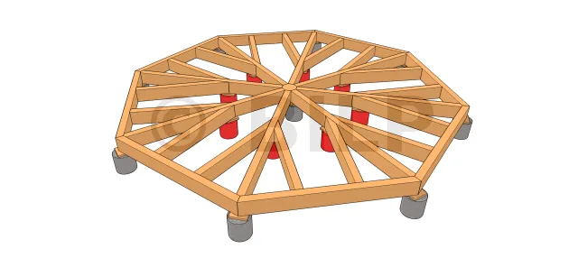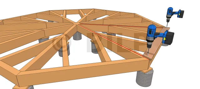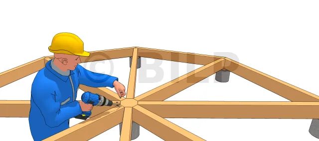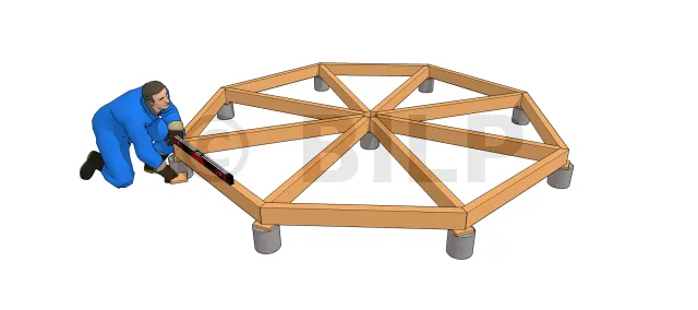 Prendre une clé de solivage coupée à la dimension du polygone pour maintenir les solives internes. Placez-la au milieu. A l’aide d’un niveau à bulle, prendre une première solive interne, niveler et fixez-la à la clé. Reprendre la même opération pour toutes les autres solives internes. Vous devez avoir au final une ossature assemblée et à niveau, composée de solives externes et internes ainsi qu’une clé au milieu de l’ensemble.