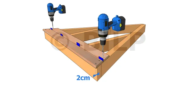 - Fixer la première lame toujours en laissant les 2 cm par rapport à la face extérieure de la solive externe.
