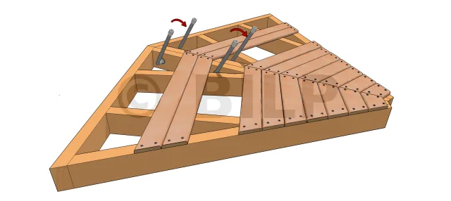 Placer une première lame de platelage sur un côté du polygone et aligner les 2 bouts en biseau de cette lame jusqu’à ce qu’ils soient parallèles aux 2 lignes de repère tracées sur les solives internes. Laisser 2 cm d’épaisseur de la lame par rapport à la face extérieure de la solive pour éviter l’écoulement des eaux le long de la solive. Pour ce faire, prendre les 2 cm à chaque bout de la lame. Fixer avec une pointe ou des vis pour platelage selon l’épaisseur de ce dernier.