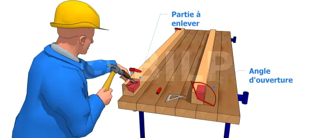 Pour ce faire, reporter la tête de la solive en biseau sur la face d’une solive interne jusqu’à ce que les deux faces (aboutage - solive interne) soient bien accolées. Vérifier que l’autre bout de cette solive intermédiaire est en contact avec la face d’une solive externe. Fixer ensuite à la vis. Vérifier avec un mètre ruban que la distance entre deux solives intermédiaires ne dépasse l’entraxe des solives calculé préalablement.