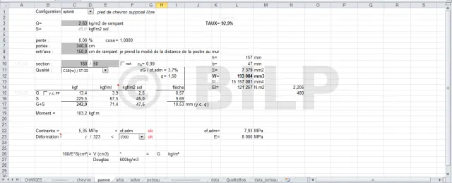 En considérant du bois massif de 500 kg/m3, la charge au m² des chevrons est : 7 chevrons x 0,030 m x 0,10 m x 3 m x 500 kg/m3 = 31,5 kg à répartir sur toute la surface de la pergola. Cette surface est égale à 4 x 3 m = 12 m². Au final, on a une charge permanente de chevron de 2,63 kg/m². On insère cette valeur dans la case G du fichier de calcul, feuille panne.