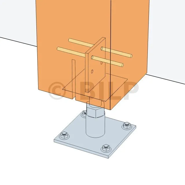 - Holzverbindung auf starrem TrägerAuf Pfosten: 2Ø8 (STD-Stabdübel oder Bolzen); auf Beton : 4Ø12 (WA-Stabdübel; Gewindestange)