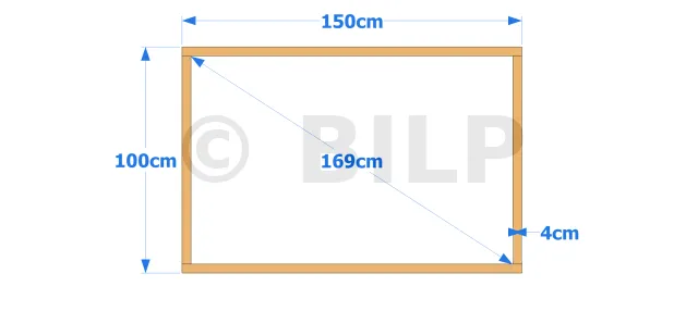 Exemple : Nous allons prendre un cadre de dimension extérieure 150 x 100 cm avec des lambourdes de 6 x 4 cm. Donc les dimensions intérieures du cadre sont de 142 x 92 cm. En mesurant la diagonale, on a 169 cm.