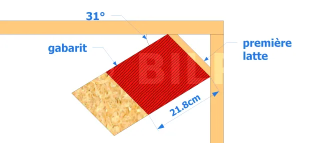 Cette illustration montre l’utilisation de deux gabarits pour avoir des lignes parallèles entre lattes car le premier panneau sur la première latte n’a pas suffisamment de longueur pour assurer le parallélisme des lattes suivantes.