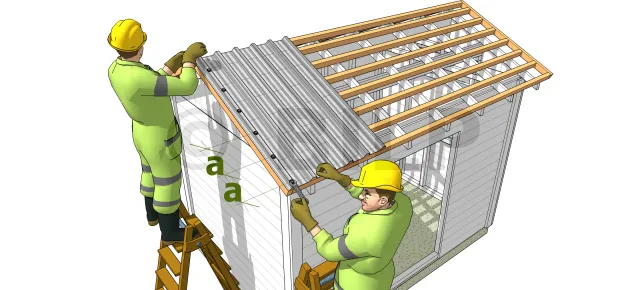 Placer la première feuille de toiture sur la charpente dans le coin bas des rives. La fixation se fait à l’aide de tire-fonds de fixation sur les lattes. Pour fixer, utiliser les parties renflées du bac acier. Comme pour toutes fixations de couverture, la pose se fait de bas en haut. L’espace maximum entre les fixations doit être au plus 20 cm.