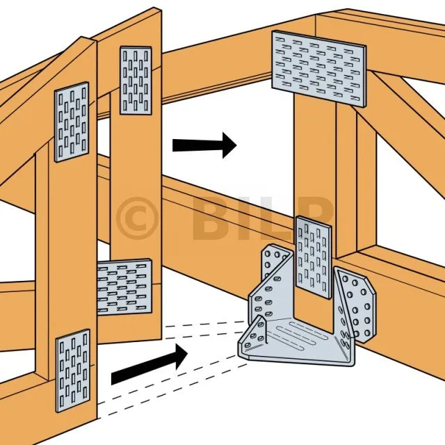 Der Rumpfbügel THJA26 wird im Fachwerk mit 38 mm Querschnitt verwendet. Es ermöglicht die Erstellung eines Grates durch Zusammensetzen der Grat- und Spannhalbbinder.