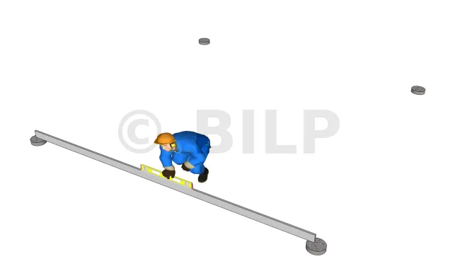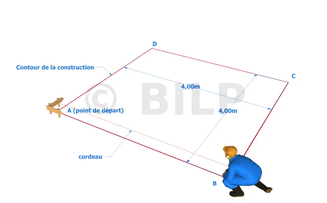 Marquer sur le sol le contour de la construction. Prendre un point A de départ et reporter la longueur de deux poutres en traçant une ligne droite à l’aide d’un cordeau (soit 4,00 m)et on obtient le deuxième point (point B). Prendre ensuite le troisième point (point C) avec une distance de 4,00 m et parfaitement perpendiculaire à la droite "AB", aidez-vous avec une équerre pour obtenir l’angle droit recherché, ou utiliser la méthode 3-4-5. Enfin, tracer une droite parallèle et de même longueur que "AB" (soit 4,00 m de long) pour obtenir le dernier point (point D) et comme vérification, regarder que la distance entre le point A et D est bien de 4,00 m. Puis fixer les pieds de poteaux à l’aide de chevilles. Fixer un pied à chaque coin du tracé et un autre sur chacune des axes des droites "AB" et "CD". Si vous avez déjà une dalle en béton comme surface d’assise, vous pouvez fixer directement les pieds de poteaux.