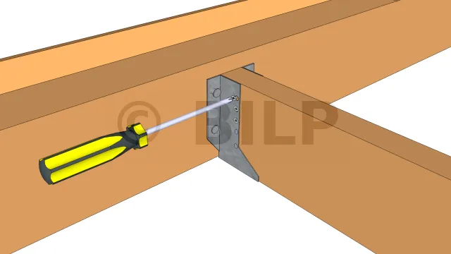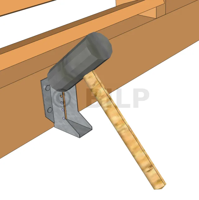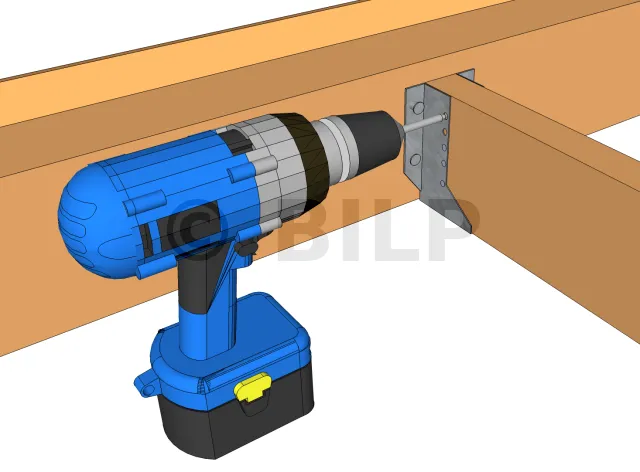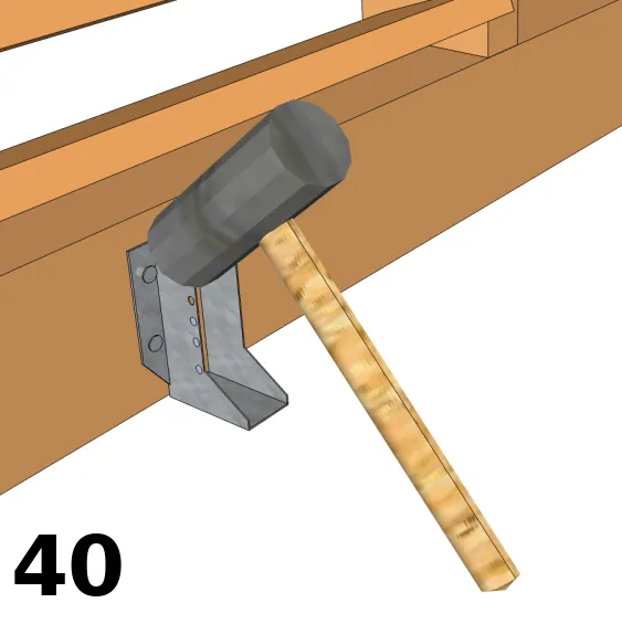 Nous allons commencer par poser les sabots en les fixant à l’aide des pointes d’ancrages annelé sur les poutres. Veuillez à ce que les deux extrémités des solives sont de même niveau. Une fois les solives installés, poser les plancher.