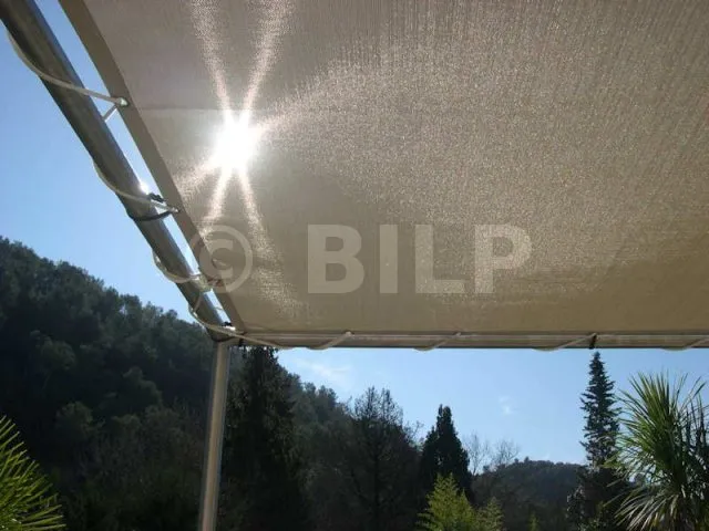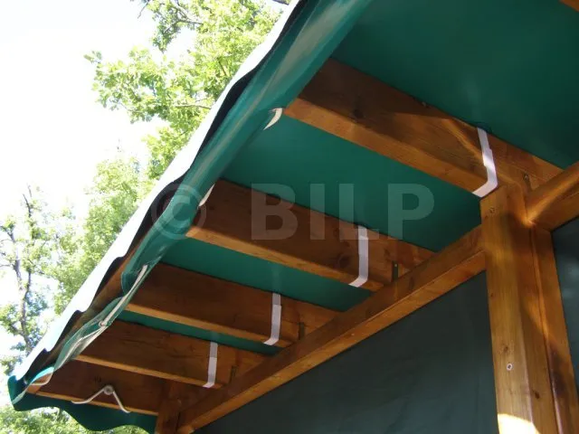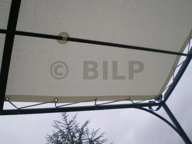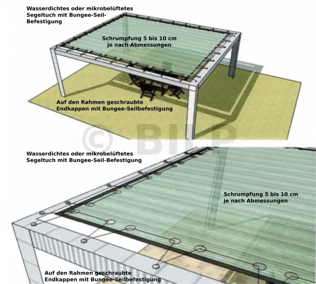 Um Ihr Segeltuch auf Ihrer Pergola zu spannen, haben Sie kaum eine andere Wahl, als Bungee-Seile zu verwenden, eine Art sehr widerstandsfähiges Gummiband. Die Bungee-Seile verlaufen durch in den Rand eingefasste Ösen und durch das Segeltuch, d.h. in den Saum, und werden am Rahmen befestigt. Manchmal wird zur Verstärkung des Segeltuchs an jeder Öse ein zusätzliches Stück aufgenäht, entweder eine durchgehende Schräge oder eine Punktverbindung.