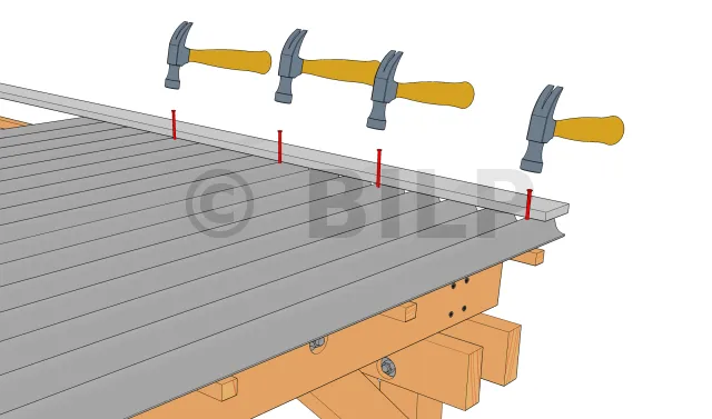 Bevor Sie den Bohrer verwenden, markieren Sie die Spitzen der Wellen. Markieren Sie mit einem scharfen Nagel und einem Hammer die Stellen, an denen Sie die Sechskant-Holzschrauben anbringen möchten. Stellen Sie sicher, dass diese Löcher richtig ausgerichtet sind. Dies ist sowohl aus technischen als auch aus ästhetischen Gründen wichtig.