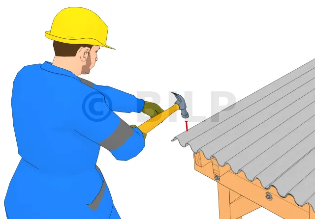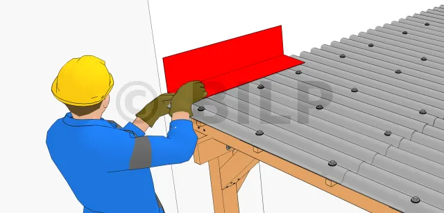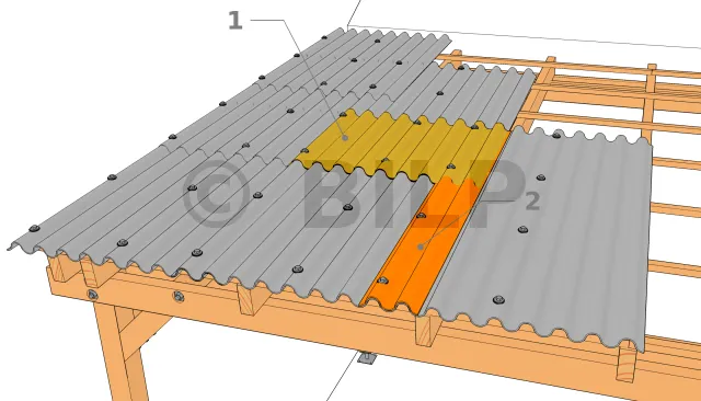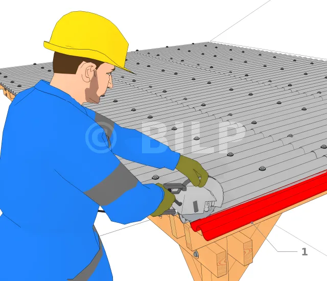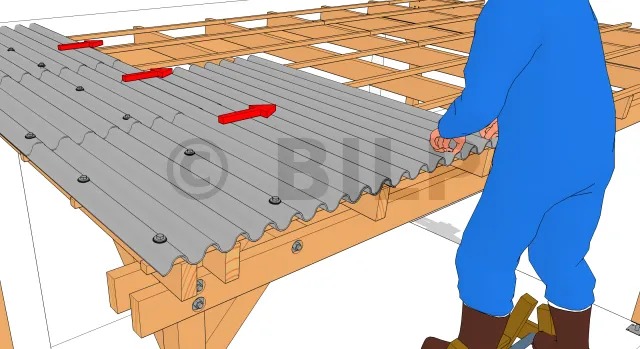 Die präzise Montage der ersten Wellplatte ist wichtig. Sie muss gut platziert werden, da die Montage der anderen Platten von ihr abhängt. Die erste Platte wird auf das Ende des Daches gelegt. Stellen Sie sicher, dass die seitlichen und frontalen Überhänge auf beiden Seiten der Enden der ersten Platte gut respektiert werden (d.h. entlang der Kanten und entlang der Rinne). Es wird empfohlen, gut zu messen und gegebenenfalls Marker zu verwenden. Prüfen Sie die Rechtwinkligkeit der ersten Platte mit den Sparren, bevor Sie sie endgültig befestigen.