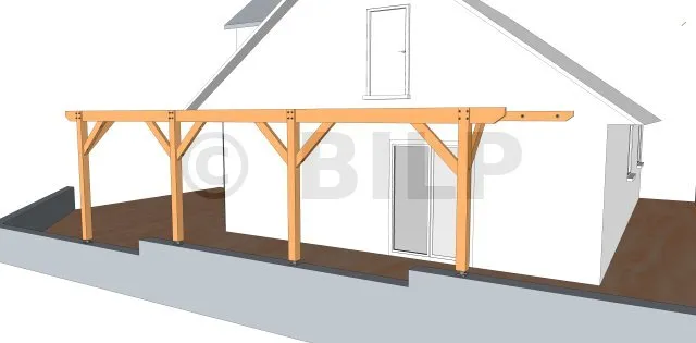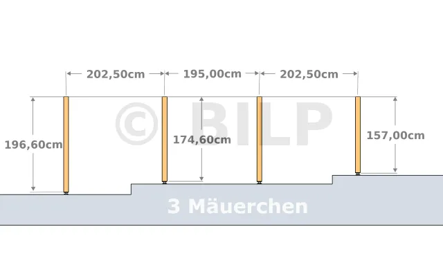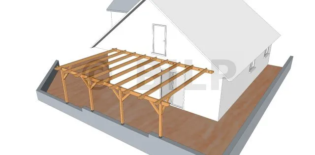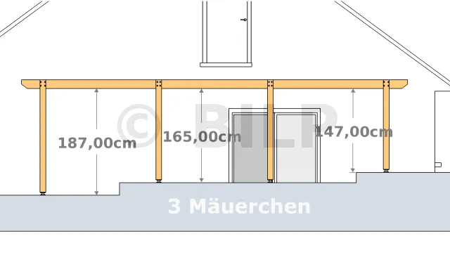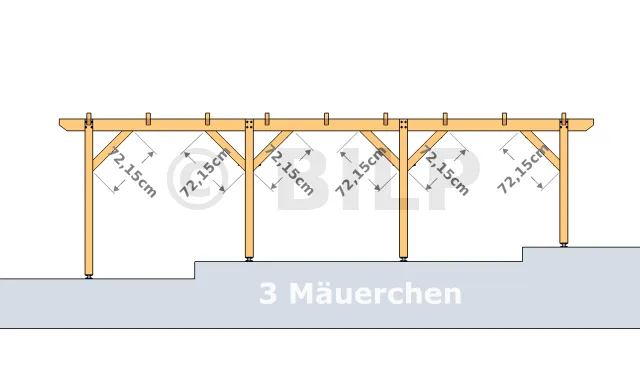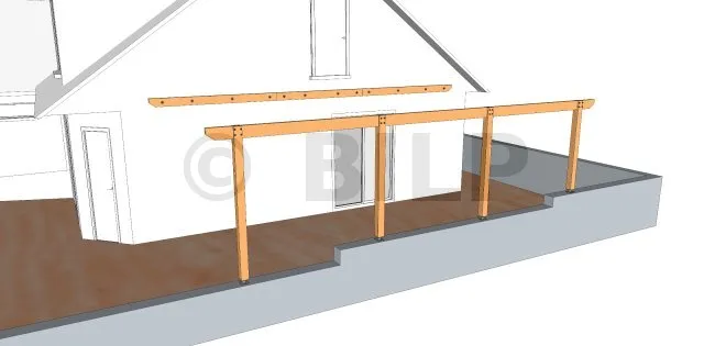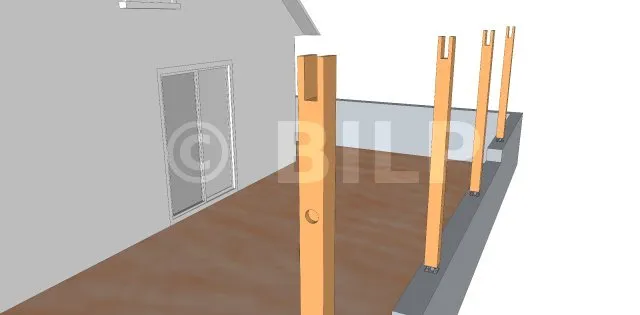 Bei einem Abschnitt der Pfette 150 x 50 mm Lärchenholz werden 4 Pfosten zur Befestigung der Pergola benötigt. Die Länge des verwendeten Pfostens ist entsprechend der Höhe jeder niedrigen Wand variabel.