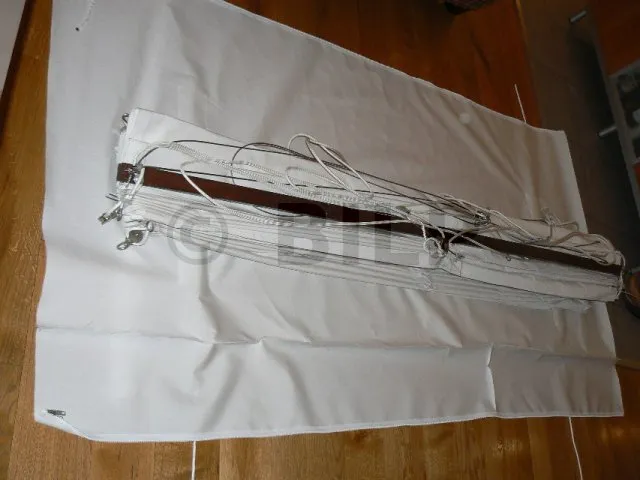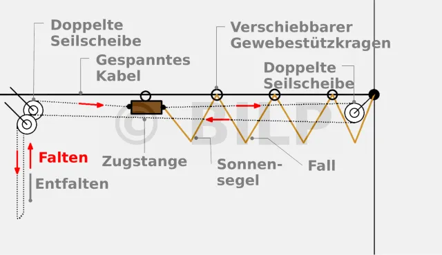 Durch Ziehen an zwei Seilen (Fallen) gleitet das Gewebe an horizontal gespannten Kabeln entlang und faltet sich ziehharmonikaartig.